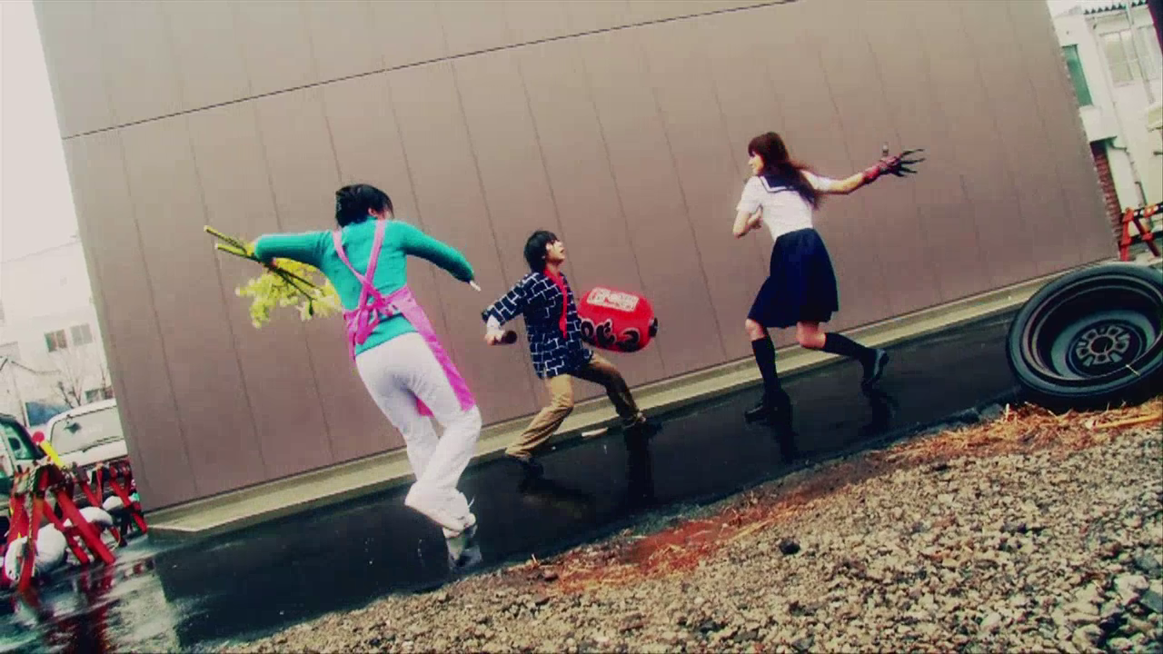 What Mutant Girls Squad does take seriously is style. On occasion, hyper-colourful elements break up the pastiche horror form, and there’s a surprising amount of variety in sets for such a low-budget production. The movie is tightly edited and populated by off-kilter shots and a smattering of green screen. It sets a pretty relentless pace from the get go, as the girls plough through soldiers and civilians alike in this slaughter fiesta. The fight scenes live up to the expectations of the genre, and pioneer Nishimura’s make-up and effects are creepily superb as always. Although, what else should we expect from someone who worked on Tokyo Gore Police and Suicide Club? The mutant girls allow him to really shine, creating both hilarious and impressive “powers,” from cosplay nurses to arse chainsaws. Yep. All three directors bring their unconventional talents here and, bar some slight style and flavour changes, each act gels together nicely. It’s even hard to pick a favourite fight scene, with each one as bizarrely impressive as the last – although it is hard to go past the french bread. Yeah, just watch it.