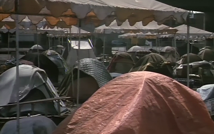 The adrenaline pumping, opening scene sees a dystopian bikie gang, The Ratts, rolling around a rundown neighbourhood. It’s dark and exciting, and they’re shooting everyone on sight, all the while titles cut slickly in and out. Did I mention that one of the shooters wears a scarf, a studded blazer, and rides in a sidecar – of course that’s the legendary Z’Dar. The gang clearly runs with reckless abandon, and is the reason police are forcibly relocating the citizens of wherever we are, under martial law. It’s a bit of a mysterious, chicken-or-the-egg scenario though. Our main man Jack Murphy, Greg Cummins, gets mixed up in this when his daddy’s factory is included in the latest round of evacuations. He can’t possibly leave, it’s all he has – never mind that he’s putting his friend, his crush-bearing secretary, and her blind brother, in mortal danger. In Jack’s defense, evacuated citizens are being dumped in refugee camps of the Hotel California variety, which look shots of actual refugee camps by the way. Then again, if they stay they get shot at, by bikies and police alike.