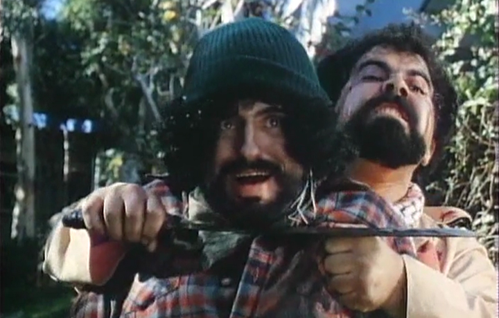 Always at the centre of the narrative, yet rarely seen, is Mitchum’s mob boss. Perhaps he cost too much to get any more screen time. He does, however, have a fantastically awkward scene where he delivers a hiring pitch to some rather unfortunate looking prostitutes. Clearly, a lot of work went into the character too, done up in all the glory of a true Godfather – Hawaiian shirt under open blazer, complemented by Aviators and a permanent cigar that makes him even harder to understand. He also employs henchmen with such names as Spaghetti – Tony Katsaras who’s recently found work on The Eric Andre Show – Animal, and Ramon. Unfortunately, I can’t tell you the names of the latter two, as they don’t seem to actually be in the credits. All I can say is that Animal, whoever he is, probably plays the best part in the movie. I’m never sure what creative orifice Shervan pulls his names from, but this movie really does take the cake. I should mention that the Hells Angels – well I assume it’s them, based on their history with such movies – make a totally silly and out of place appearance to aid Turkey as the climax draws near.