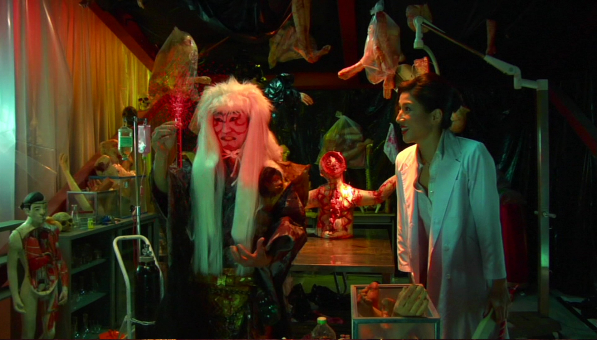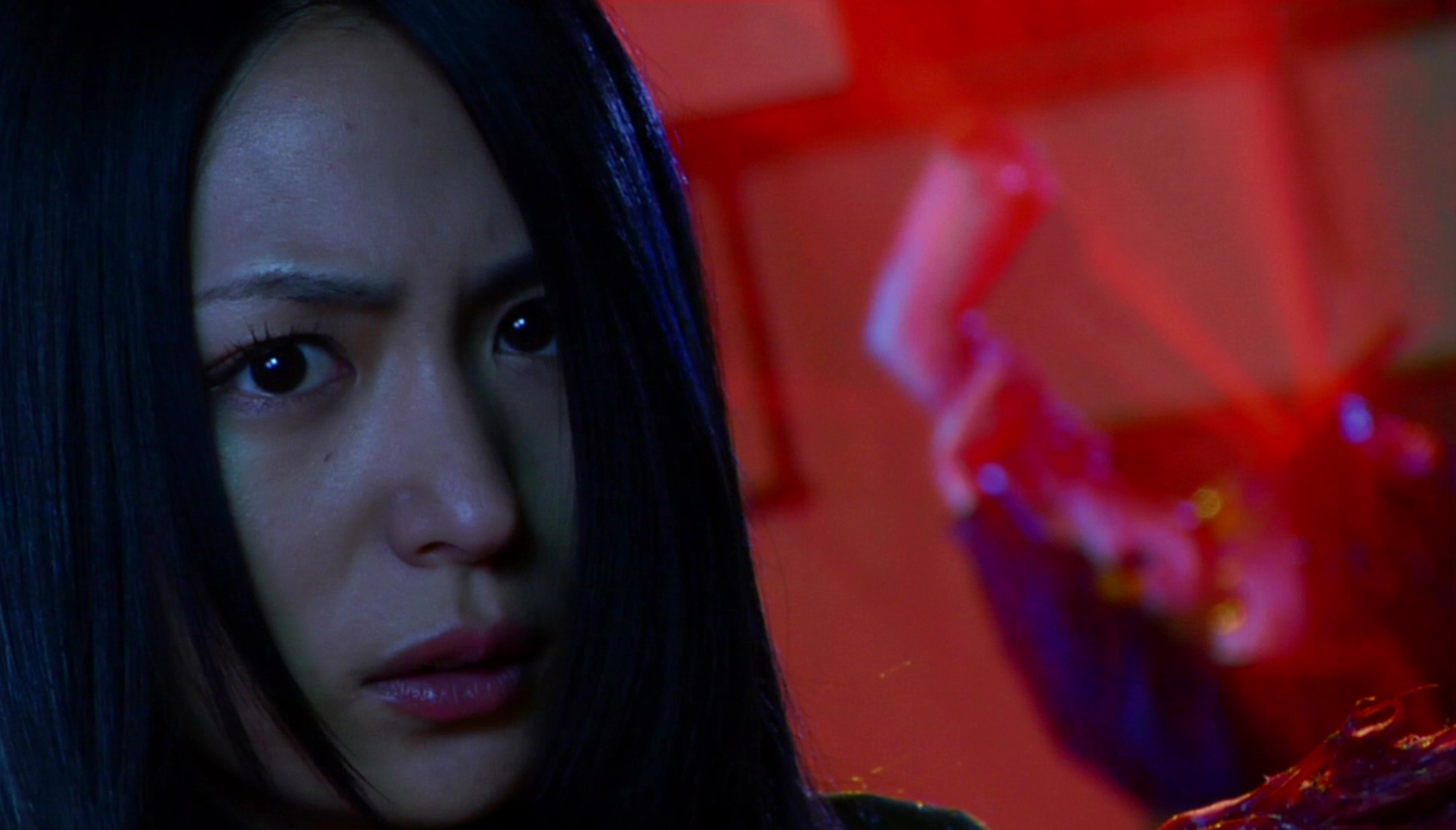 Loosely based on a manga by Shungicu Uchida, the story is at its core a dramatic love triangle. Fortunately it’s livened up by copious, off-the-wall humour and silly gore. Think Twilight, but good, and on acid. See, Gothic type Keiko, Elly Otoguro, is apparently into Jyugon, Takumi Saito. So too is the “unremarkable” exchange student Monami, Yukie Kawamura, who just happens to be a vampire. Problems arise when Monami gives Jyugon a blood-laced chocolate on Valentine’s Day, a thing girls do in Japan, at least without the blood. Not a bad custom I say. This causes him to transform into a vampire himself, and kind of pisses off the ever-pouty Keiko, who starts a rumble with Monami and promptly loses by falling to her death. If that sounds silly, wait, it only gets crazier. While Jyugon deals with his slow transformation, and his budding romance, Keiko’s dad, Kanji Tsuda of Ju-on, goes all Herbert West on his daughter’s corpse. There is a bit of an explanation given – told by him to the camera, no less – about being a deluded super-scientist who seeks to become a real life Dr Frankenstein. His assistant in this disturbing pursuit, for some unknown reason, is the hot school nurse, Midori, Sayaka Kametani.