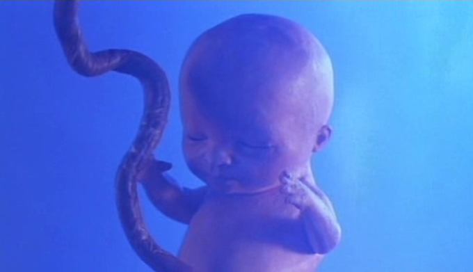 For all its relatively impressive visuals, exciting action, and Terminator imitating, perhaps the greatest feature of the movie – perhaps even Davidson’s greatest gift to cinema – is the foetus shot. Yeah. Not only is it an ingenious way to avoid having your lead actress in pregnancy costume the whole time, the glowing tank of foetus in Mary’s backpack is a frequent source of utterly disturbing hilarity. Words can barely do justice to the seemingly impossible balance of stupidity and genius that thing represents, and boy is it ugly. I also have to extend some of the praise to Alain Jakubowicz for splicing those shots in to such unsettling and comedic effect. The guy is a b movie legend in his own right, by the way, having done everything from editing Cyborg to production managing Masters of the Universe. There’s also the touch – deft or daft, I’m not sure – of an infectiously odd soundtrack, by a guy with one prior movie credit, Blake Leyh. He obviously got the Terminator memo, employing sporadic, heavy drums, weird industrial noises, and sparse synth riffs. These are gloriously repeated, almost tediously, throughout scenes, capped off with some harmonica, and the foreboding chants of a monk chorale, years before Marty O’Donnel perfected it on Halo. This silly attempt at an epic score is complemented nicely by the awfully poor sound effects, featuring some hilariously obvious dubs.