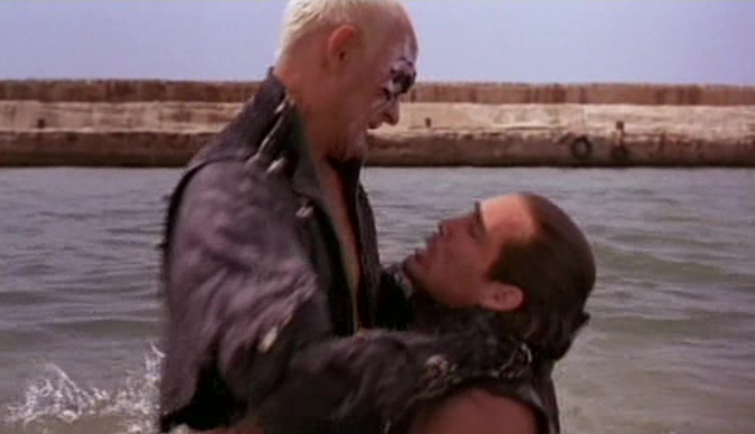 The focal point of the movie is the resourceful, yet vulnerable Mary – Nicole Hansen, who has a couple of fantastic looking credits but not much else. She’s the last fertile woman on earth, or at least locally, and under the medical aid of the rebels she has produced the first human foetus since the apparent nuclear war. I’m a little suspicious of exactly how they found out she was fertile though. She’s called Mary because she must travel to the promised land in Europe to save the child from certain death. Yeah, the Bible is another title heavily plundered for this narrative. Unfortunately a big-old, white-haired cyborg is programmed to stop her – one of those bits of Blade Runner I mentioned. Luckily she happens across Tarzan, I mean Austin – Joe Lara, soon to be of minor TV fame for hanging out with Jane. Sadly the cyborg never gets a name – John Ryan, who’s list of credits is long but only notable for Coronation Street which he somehow bagged right after this – but he’s basically the T1000. He relentlessly pursues Mary, her unborn child, and their protector, destroying everyone in his path. If that wasn’t bad enough, the pair (or should I say trio, what’s the medical consensus on foetuses?) have to fight all manner of weird dystopian baddies, and each other, while dodging acid rain, to deliver the miracle child (almost child?) to safety. I’m happy to say they look the part at least.