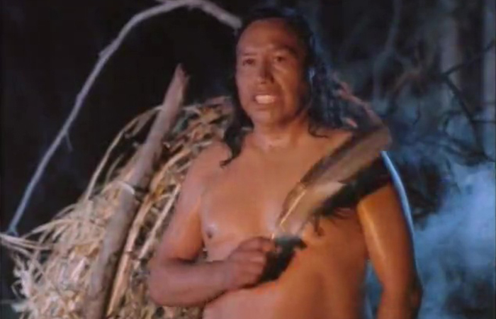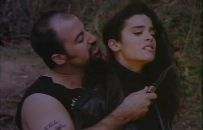 Once up in the hills, things start to go properly wrong. Bikers appear and the girls are visibly excited, yet they surprisingly turn out to be loathsome caricatures, and the source of much danger to come. We also meet an alcoholic prospector, who warns everyone to stay away from the demons in the mountains, then comes along for the ride anyway. That’s Buck Flower by the way, a guy who’s played a hobo in everything from Back to the Future to They Live. At least he gets the fantastic line “I gotta have a beer, I don’t wanna die with an empty bladder.” The first real instance of the supernatural coming out to play is an ominous shot of a Native American chief, presumably a ghost, looking down at the group. It’s really just good for a laugh though. The group are further warned off by a medicine man performing a ritual, and once again ignore the wisdom. Things really hit the fan when the group gets split up through a series of silly circumstances, and a bizarre array of threats appear – including those horny bikers, the giant druid, and a massive snake head in a lake (also a total crack-up). I don’t want to spoil too much, but the druid has super strength and is into ritual sacrifice. Also, the pissweak redemption tale I mentioned happens to the leader of those despicable bikers, James Kratt in his debut role of not many to follow. But I won’t ruin how.
