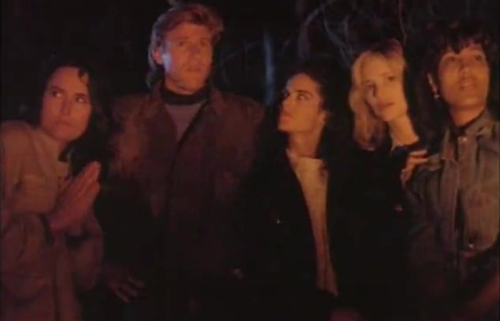 After an abysmal title sequence – a blurry still of a pink moon with heavy breathing overdubbed – the opening scene is an incongruous, Playboy-style sequence of our sorority girls getting out of bed and into the shower. Supposedly the illustrious Fred Olen Ray lent his expertise here, re-shooting Keith’s original opening to make it more, uhh, appealing. That does make a lot of sense, as we meet characters who have no further part in the movie here, and some just seem like script double-ups. Seriously though, how does a sorority house with that many babes exist, let alone co-exist with only one shower? I’ve dwelled on that too long now, but it’s probably the most interesting thing to happen until 20 minutes in when we meet the service station owner I mentioned. Between are a bunch of pointless scenes of poor character development, including a garbage song-and-dance routine, and lengthy exposition to get us up into the mountains. Props, though, to Keith and future Baywatch actor Vincent Van Patten for providing a little of that information and foreshadowing as a somewhat compelling lecture on religion throughout the ages. Van Patten is the hunky professor Mike, organiser of the mountain trip in question, travelling to an ancient Native American camping ground in search of anthropological artefacts.