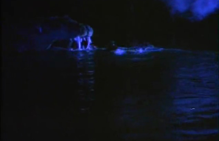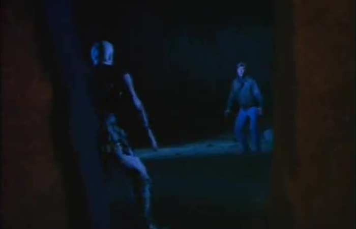 I’m going to touch on the stylistic elements of Camp Fear just because, without their utter tackiness and unintentional comedic value, this movie would be, ironically, totally unwatchable. The lack of budget permeates every shot, from the tight and confusing sequences of our protagonists running through the bush – which looks like it was probably just a tiny patch re-used again and again – to the copious amounts of night scenes shot under blue lights. Hey, it’s miles better than day-for-night. There were apparently two cinematographers on board, and two filming units, but it looks more like barely one professional. Everything is shot so tightly, presumably thanks to the sets and locations, that it all seems claustrophobic, and the framing is frequently off. The cluttered and silly script comes out even worse thanks to some painful editing by Terry J Chiappe – who went on to work on a couple of Shannon Tweed flicks. Though that could be a chicken and the egg thing. Seriously though, it often seems like lines have gone missing between cuts, and scenes jump around with incomprehensible causality. Then there is the criminally small amount of action, which is so stiffly shot and cut together, and just horribly choreographed and executed. The jump scares take the cake though, more like jump laughs, and provide some of the best moments of the movie.